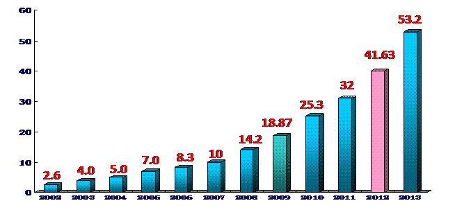 2002年—2013年公司营业收入增长情况(单位:亿元)