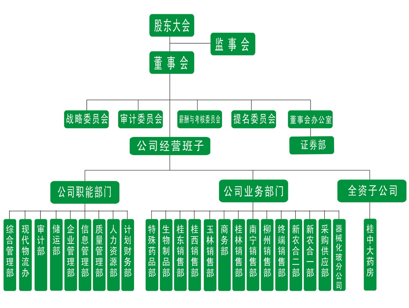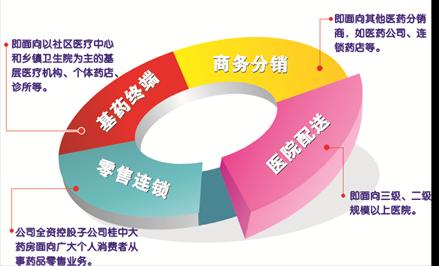 中国药品零售连锁行业100强企业——柳州桂中大药房连锁有限责任公司是柳药股份全资控股子公司,是柳州市首家通过国家药品经营质量管理规范(GSP)认证的医药连锁企业。公司有直营药店117家,医疗保险定点药店45家,2013年实现销售3.49亿元,在2012全国药品零售企业销售总额百强榜中排名第47位,已形成以柳州为中心,向全区10个中心城市布局设店的连锁网络。